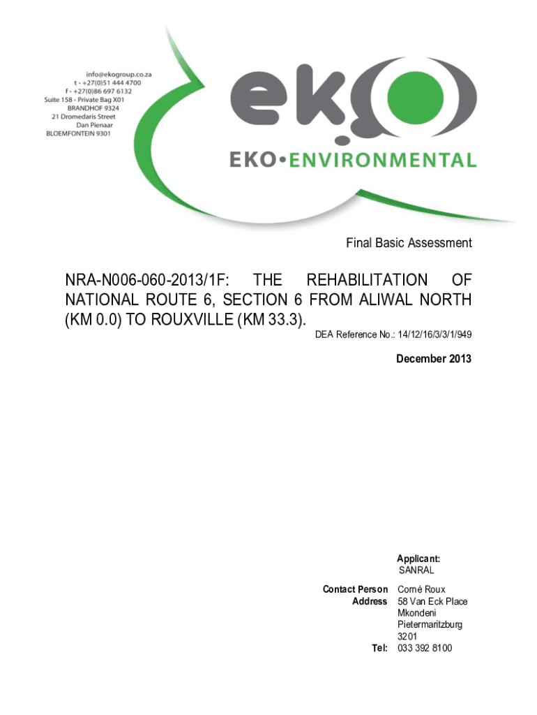 Final Basic AssessmentNRAN0060602013/1F: THE REHABILITATION OF NATIONAL ROUTE 6, SECTION 6 FROM ANIMAL NORTH (KM 0.0) TO ROCKVILLE (KM 33.3). DEA Reference No.: 14/12/16/3/3/1/949December 2013Applicant: