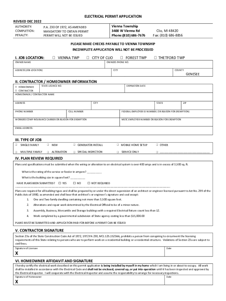 ELECTRICAL PERMIT APPLICATION REVISED DEC 2022 AUTHORITY: COMPLETION: PENALTY:Vienna Township 3400 W Vienna Rd Phone:(810) 6867676P. A. 230 OF 1972, AS AMENDED MANDATORY TO OBTAIN PERMIT WILL NOT