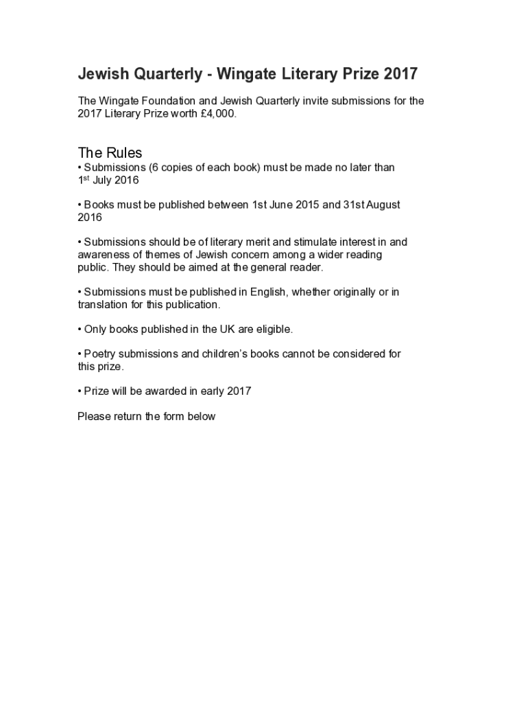 Jewish Quarterly Win gate Literary Prize 2017 The Win gate Foundation and Jewish Quarterly invite submissions for the 2017 Literary Prize worth 4,000. The Rules Submissions (6 copies of each book)