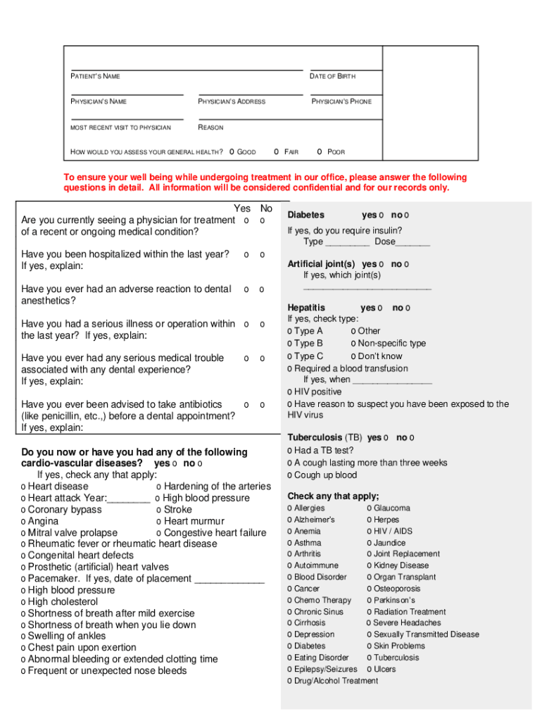 PATIENTS NAMED ATE OF BIRTHPHYSICIANS PATAPHYSICIANS ADDRESSES RECENT VISIT TO PHYSICIANREASONHOW WOULD YOU ASSESS YOUR GENERAL HEALTH?o GOODPHYSICIANS PHONEoFAIRoPOORTo ensure your well-being while