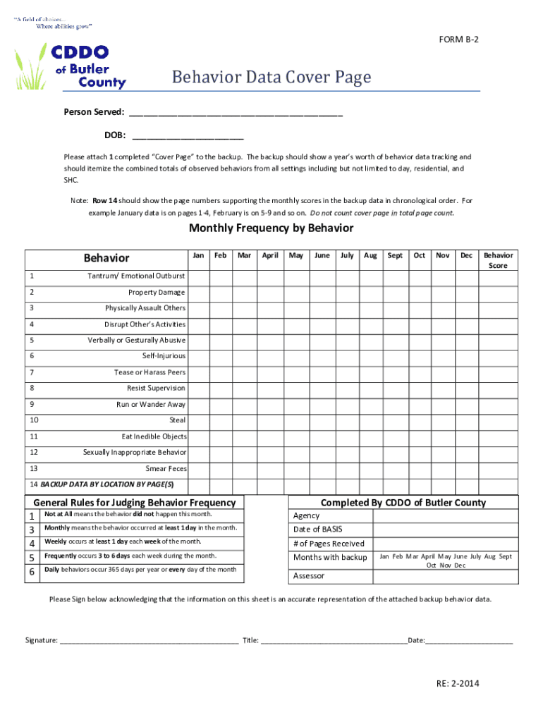 FORMB2 Behavior Data Cover PagePersonServed:___ DOB:___ Pleaseattach1completedCoverPagetothebackup. Thebackupshouldshowayearsworthofbehaviordatatrackingand shoulditemizethecombinedtotalsofobservedbehaviorsfromallsettingsincludingbutnotlimitedtoday,