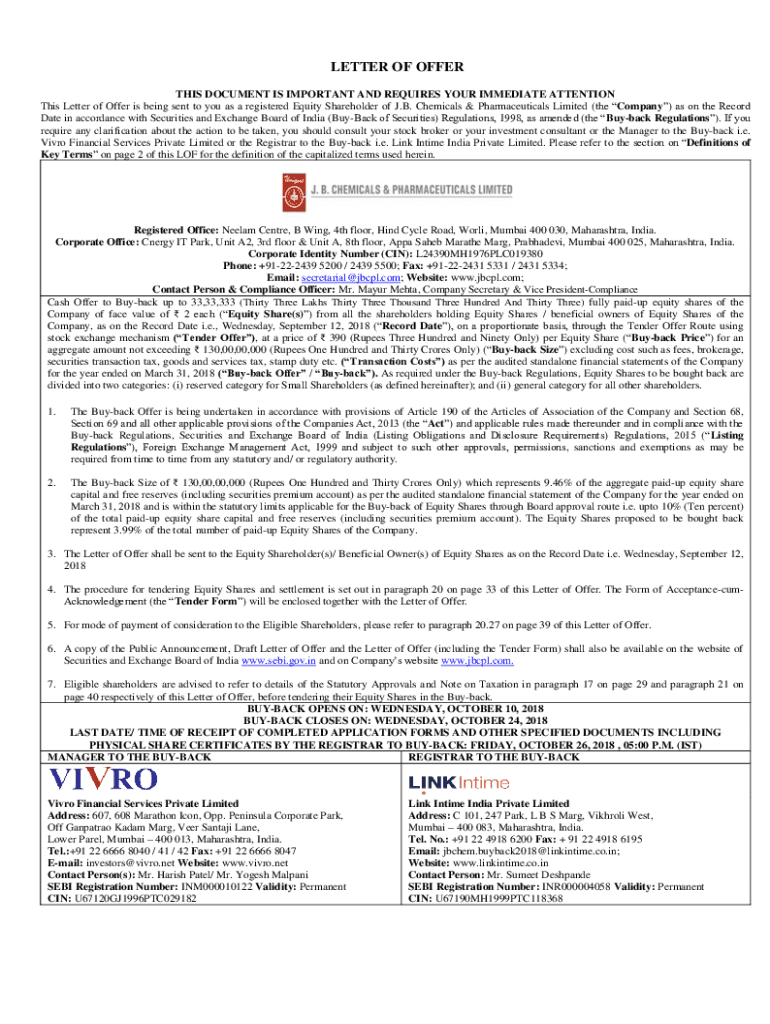 LETTER OF OFFER THIS DOCUMENT IS IMPORTANT AND REQUIRES YOUR IMMEDIATE ATTENTION This Letter of Offer is being sent to you as a registered Equity Shareholder of J.B. Chemicals & Pharmaceuticals Limited