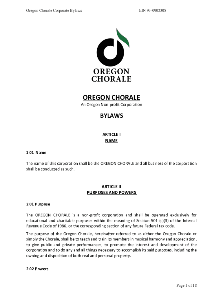 Oregon Chorale Corporate Bylaws EIN 930902308OREGON Chorale Oregon Nonprofit CorporationBYLAWS