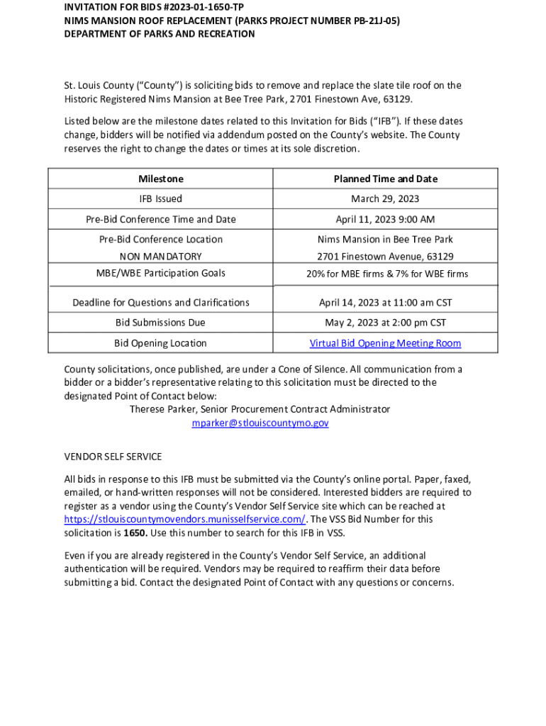 INVITATION FOR BIDS #2023011650TP AIMS MANSION ROOF REPLACEMENT (PARKS PROJECT NUMBER PB21J05) DEPARTMENT OF PARKS AND Recreations. Louis County (County) is soliciting bids to remove and replace the