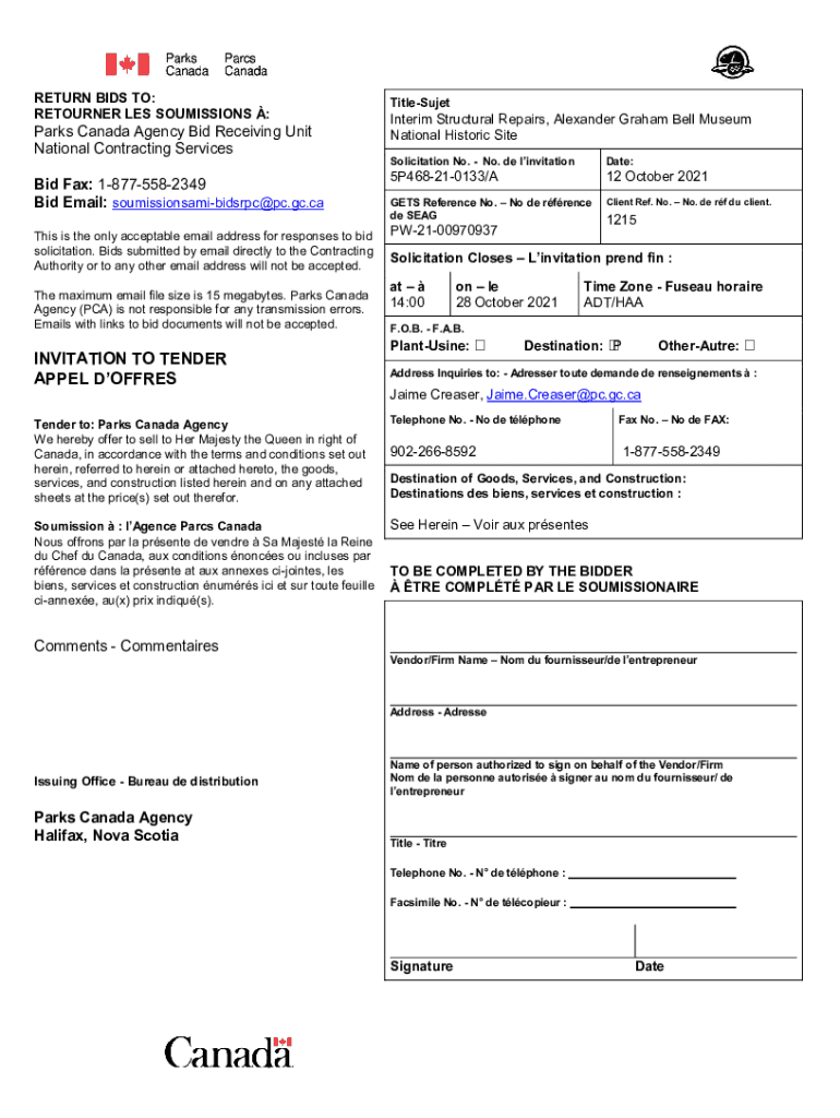 RETURN BIDS TO: RETURNER LES COMMISSIONS :Parks Canada Agency Bid Receiving Unit National Contracting Services Bid Fax: 18775582349 Bid Email: soumissionsamibidsrpc@pc.gc.ca This is the only acceptable