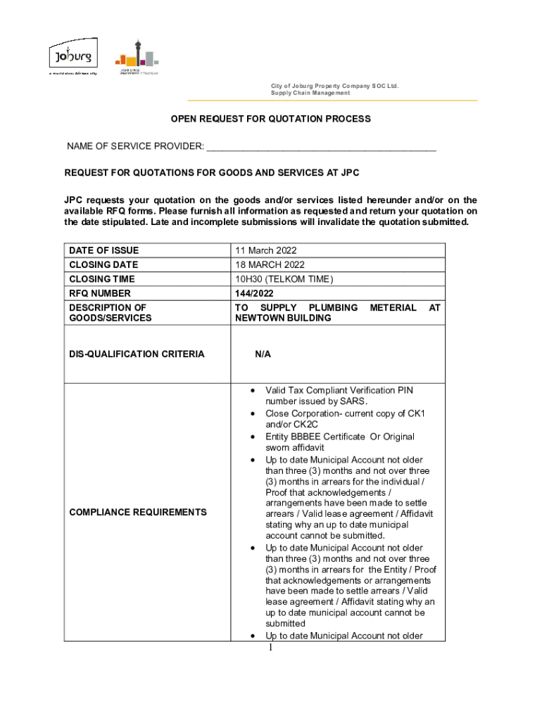 City of Jo burg Property Company SOC Ltd. Supply Chain ManagementOPEN REQUEST FOR QUOTATION PROCESS NAME OF SERVICE PROVIDER: ___ REQUEST FOR QUOTATIONS FOR GOODS AND SERVICES AT PC requests your