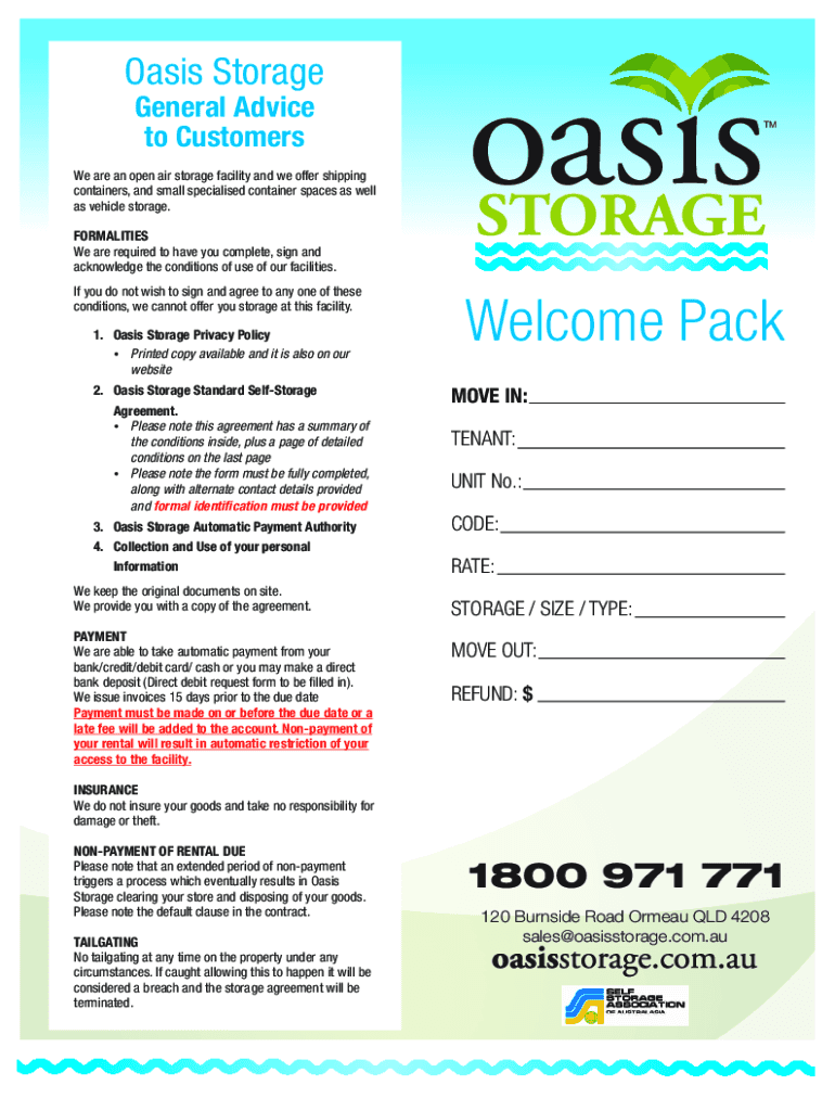 Oasis Storage General Advice to CustomersTMWe are an open air storage facility, and we offer shipping containers, and small specialized container spaces as well as vehicle storage. FORMALITIES We