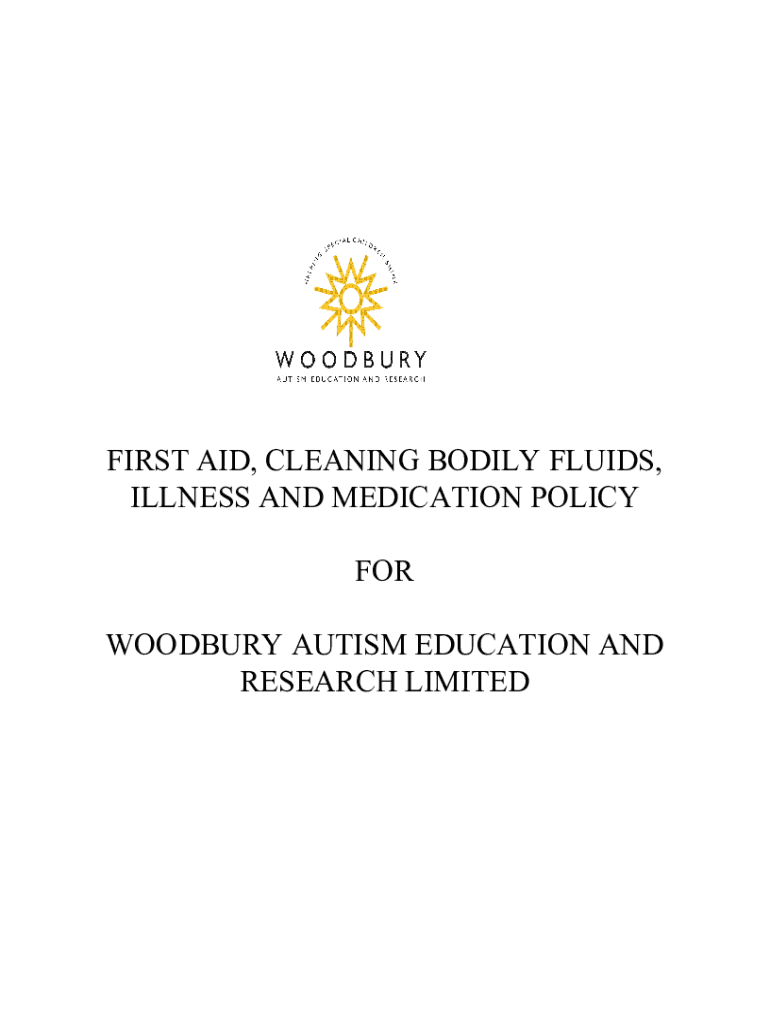 FIRST AID, CLEANING BODILY FLUIDS, ILLNESS AND MEDICATION POLICY FOR WOODBURY AUTISM EDUCATION AND RESEARCH LIMITEDFIRST AID POLICY Woodbury is committed to the provision of adequate first aid facilities