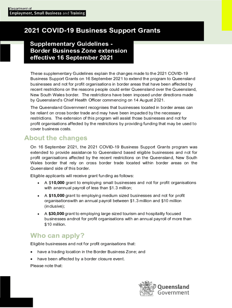 2021 COVID-19 Business Support Grants Supplementary Guidelines Border Business Zone extension effective 16 September 2021 These supplementary Guidelines explain the changes made to the 2021 COVID-19