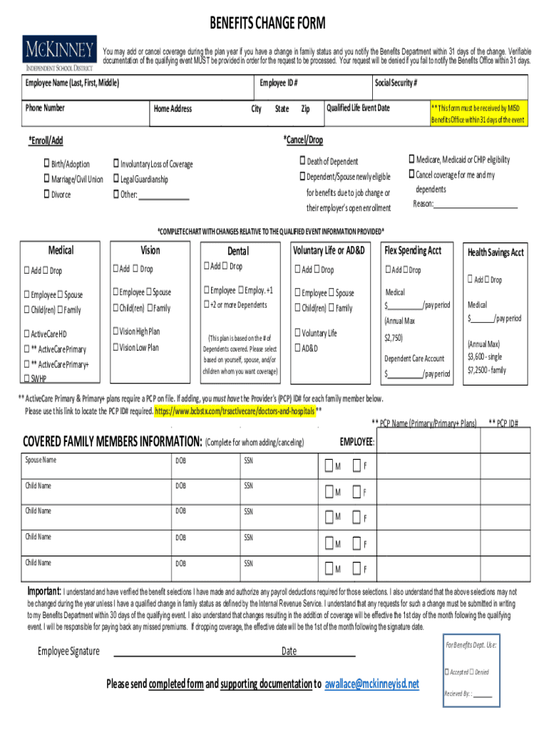 BENEFITS CHANGE FORM You may add or cancel coverage during the plan year if you have a change in family status, and you notify the Benefits Department within 31 days of the change. Verifiable documentation