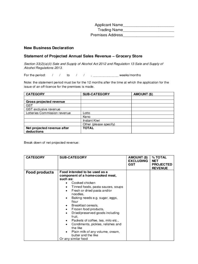 Applicant Name___ Trading Name___ Premises Address___New Business Declaration Statement of Projected Annual Sales Revenue Grocery Store Section 33(2)(a)(ii) Sale and Supply of Alcohol Act 2012 and