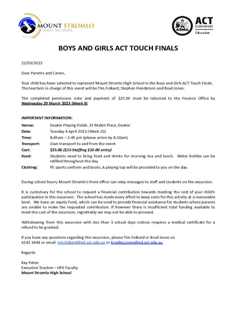 BOYS AND GIRLS ACT TOUCH FINALS 22/03/2023 Dear Parents and Carers, Your child has been selected to represent Mount Stroll High School in the Boys and Girls ACT Touch Finals. The teachers in charge