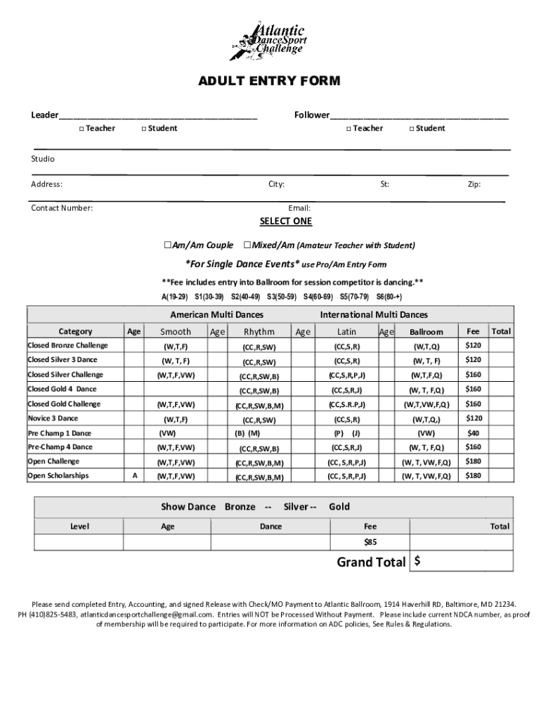 Address:City:Contact Number:St:Zip:Email:SELECT ONDAM/Am Couple Mixed/Am (Amateur Teacher with Student)