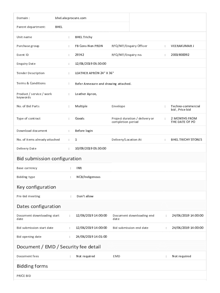 Domain :BAEL.procure.company department:Blunt name:BAEL TrichyPurchase group:FB Cannon PRDNRFQ/NIT/Inquiry Officer:VEERAKUMAR Event ID:29742RFQ/NIT/Inquiry no.:2001900092Enquiry Date:12/06/2019 05:30:00Tender