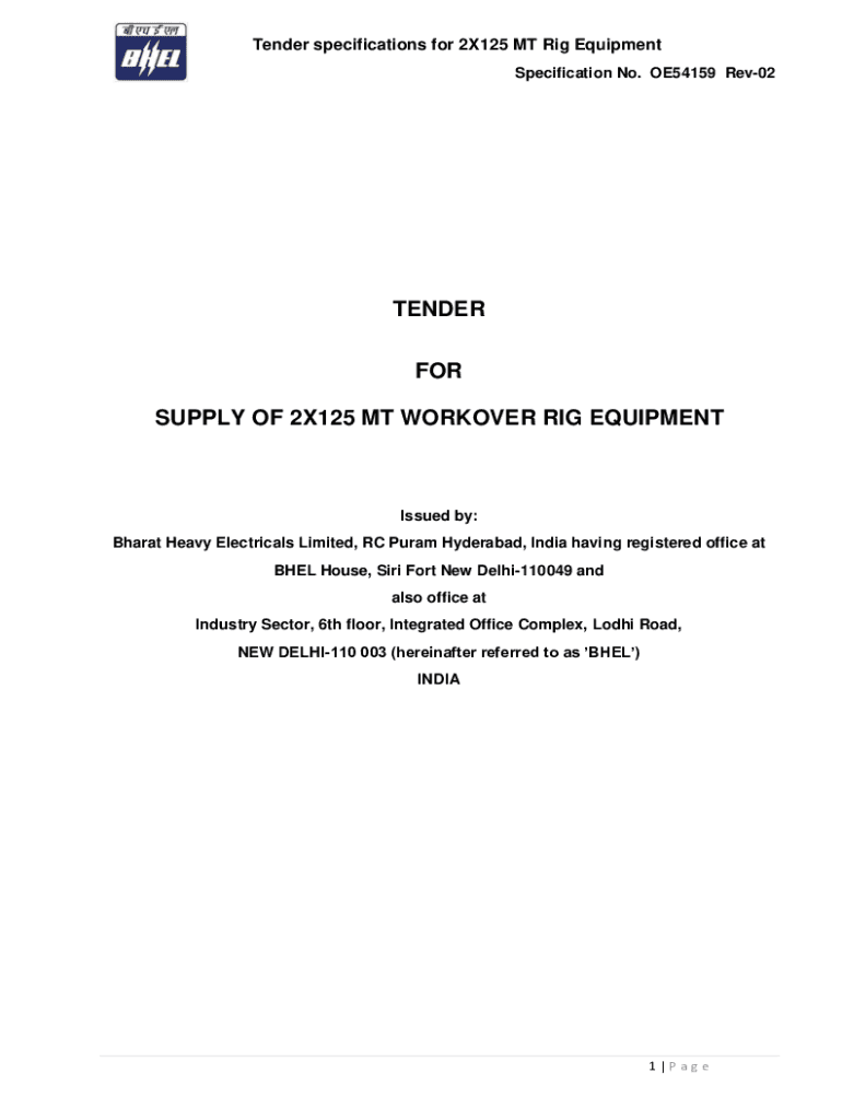 Tender specifications for 2×125 MT Rig Equipment Specification No. OE54159 Rev02TENDER FOR SUPPLY OF 2×125 MT WORKER RIG EQUIPMENTIssued by: Bharat Heavy Electrical Limited, RC Purim Hyderabad,