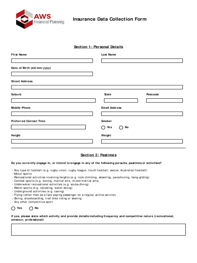 Insurance data collection form is a document used by insurance companies to gather information about policyholders and claims.