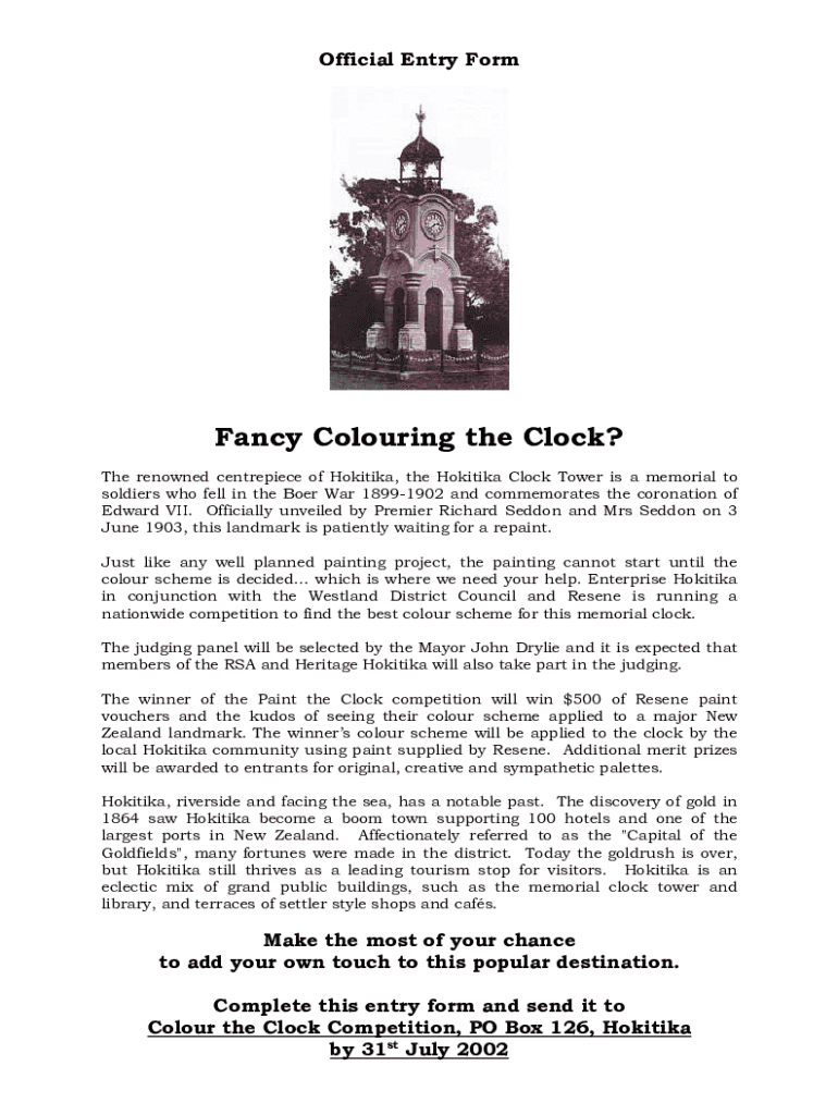 Get the free Paint the Hokitika Clock. Paint the Hokitika Clock competition