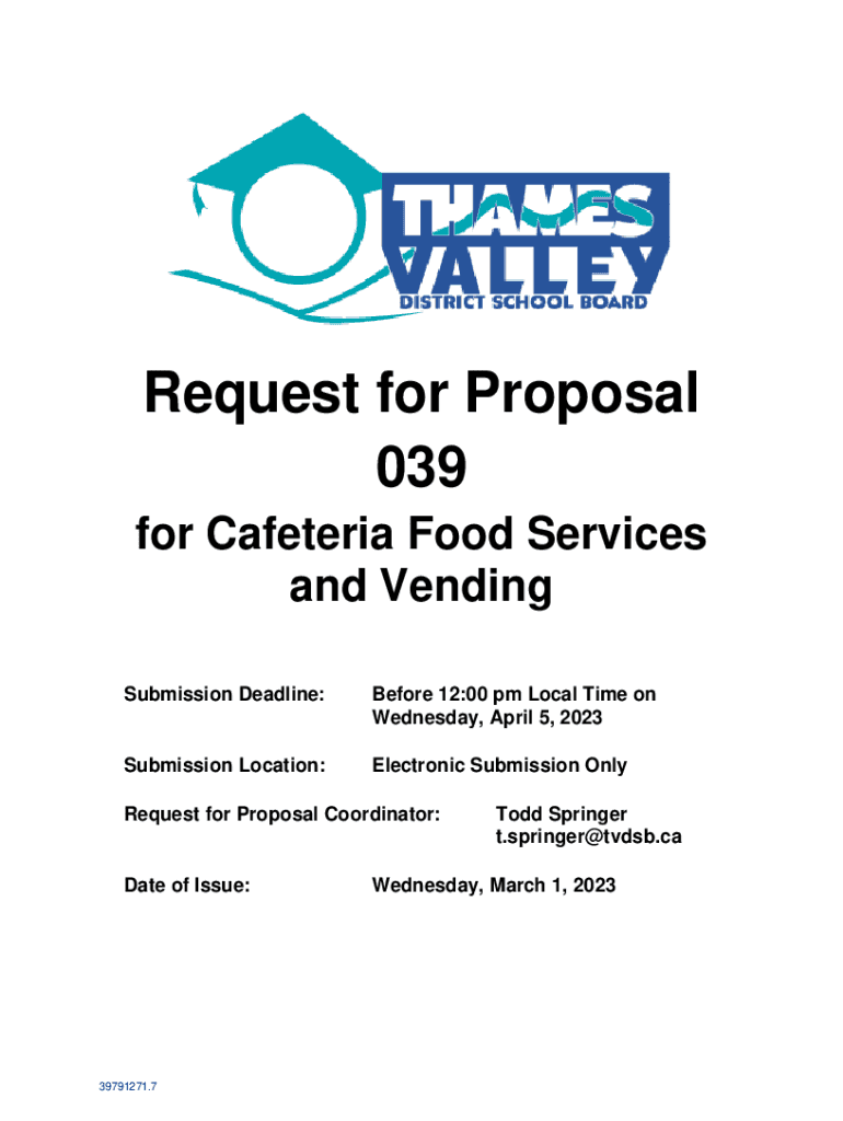 Request for Proposal 039 for Cafeteria Food Services and Vending Submission Deadline:Before 12:00 pm Local Time on Wednesday, April 5, 2023Submission Location:Electronic Submission OnlyRequest for