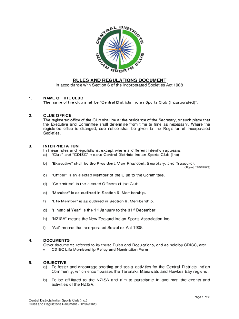 RULES AND REGULATIONS DOCUMENT In accordance with Section 6 of the Incorporated Societies Act 19081.NAME OF THE CLUB The name of the club shall be Central Districts Indian Sports Club (Incorporated).2.CLUB