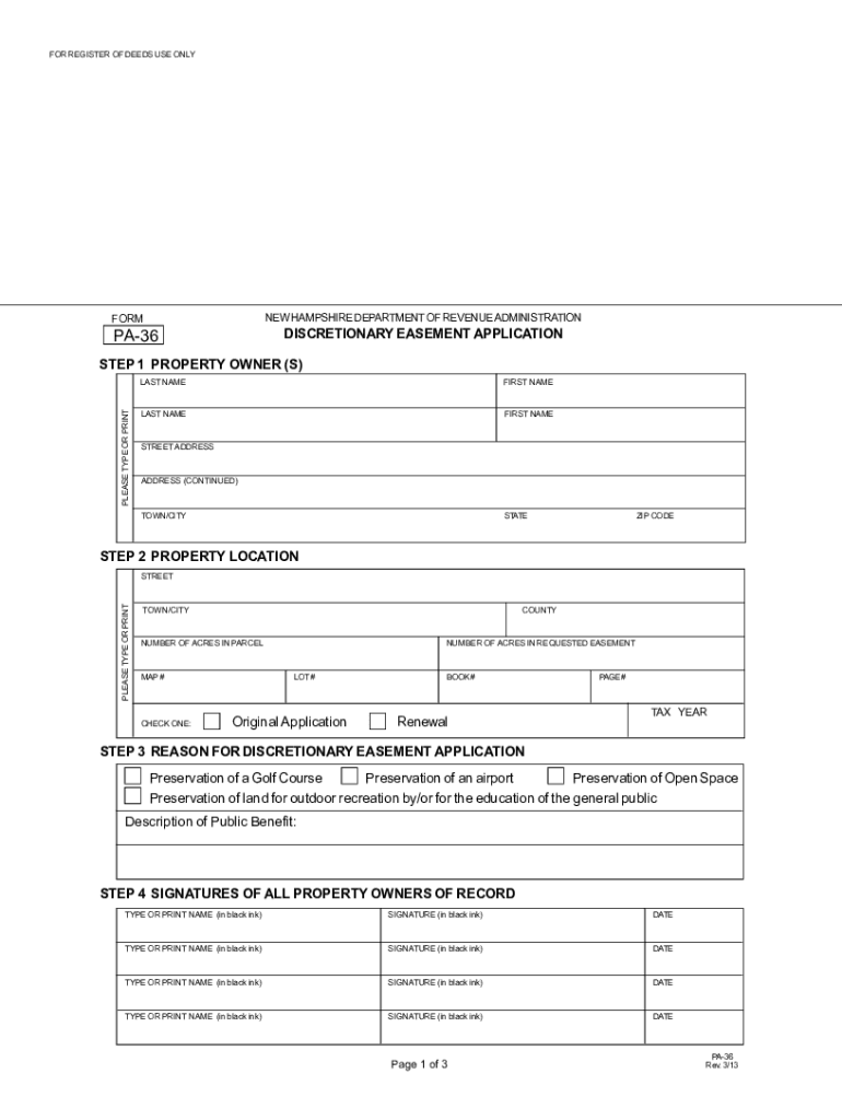 FOR REGISTER OF DEEDS USE ONLINE HAMPSHIRE DEPARTMENT OF REVENUE ADMINISTRATIONFORMDISCRETIONARY EASEMENT APPLICATIONPA36PLEASE TYPE OR PRINTS TEP 1 PROPERTY OWNER (S)