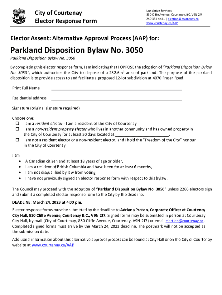 City of Courtesy Elector Response Non-legislative Services 830 Cliff Avenue, Courtesy, BC, V9N 2J7 2503344441 | election@courtenay.ca www.courtenay.ca/AAPElector Assent: Alternative Approval Process