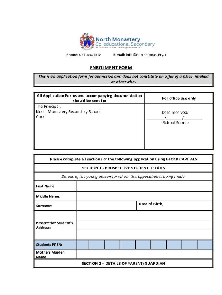Phone: 0214301318Email: info@northmonastery.ieENROLMENT FORM This is an application form for admission and does not constitute an offer of a place, implied or otherwise. All Application Forms and