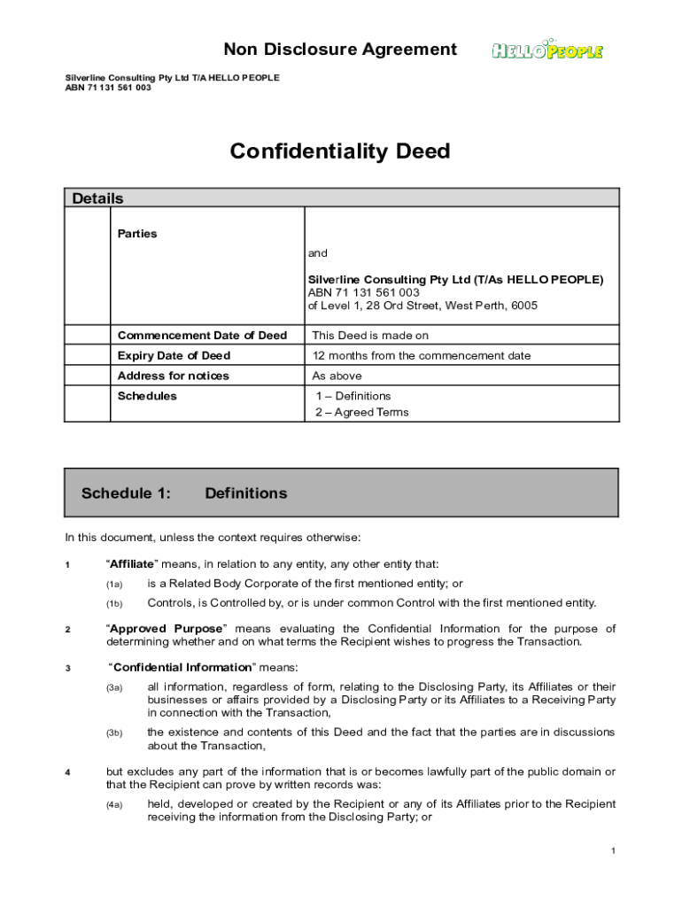 Non Disclosure Agreement Silver line Consulting Pty Ltd T/A HELLO PEOPLE ABN 71 131 561 003Confidentiality Deed Details Parties and Silver line Consulting Pty Ltd (T/As HELLO PEOPLE) ABN 71 131 561