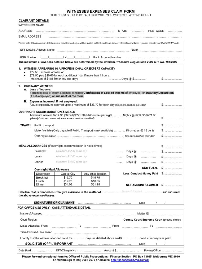 WITNESSES EXPENSES CLAIM FORM THIS FORM SHOULD BE BROUGHT WITH YOU WHEN YOU ATTEND COURTCLAIMANT DETAILS WITNESSES NAME ADDRESS.EMAIL ADDRESSSTATEPOSTCODE