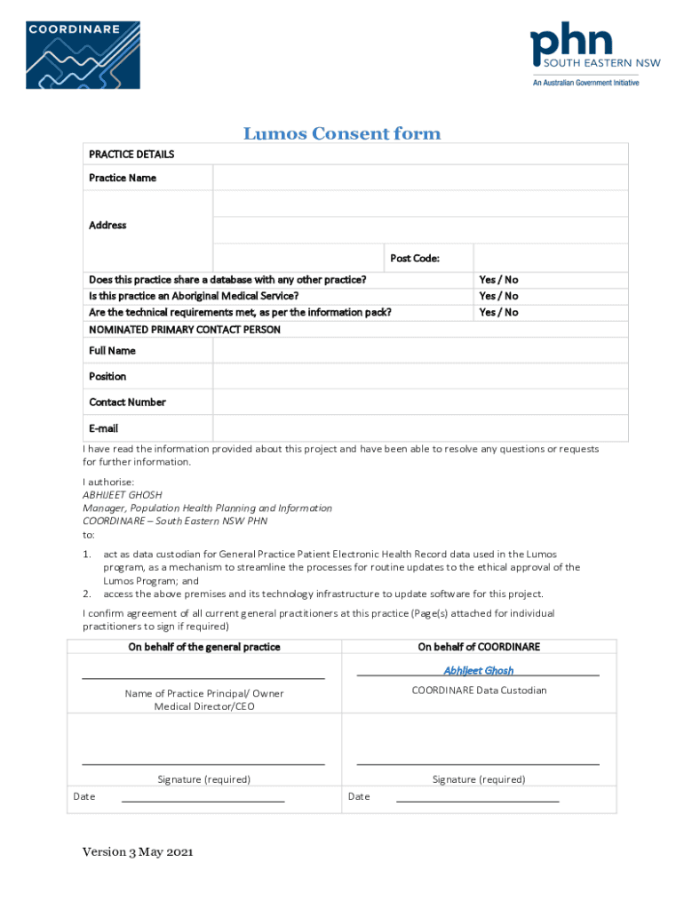 Lumps Consent form PRACTICE DETAILS Practice Headdress Post Code: Does this practice share a database with any other practice? Yes / Noise this practice an Aboriginal Medical Service? Yes / Are the