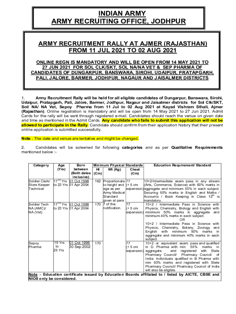 Individuals who meet the eligibility criteria set by the Indian Army and are interested in joining the Army through the ARO Jodhpur recruitment process are required to file.