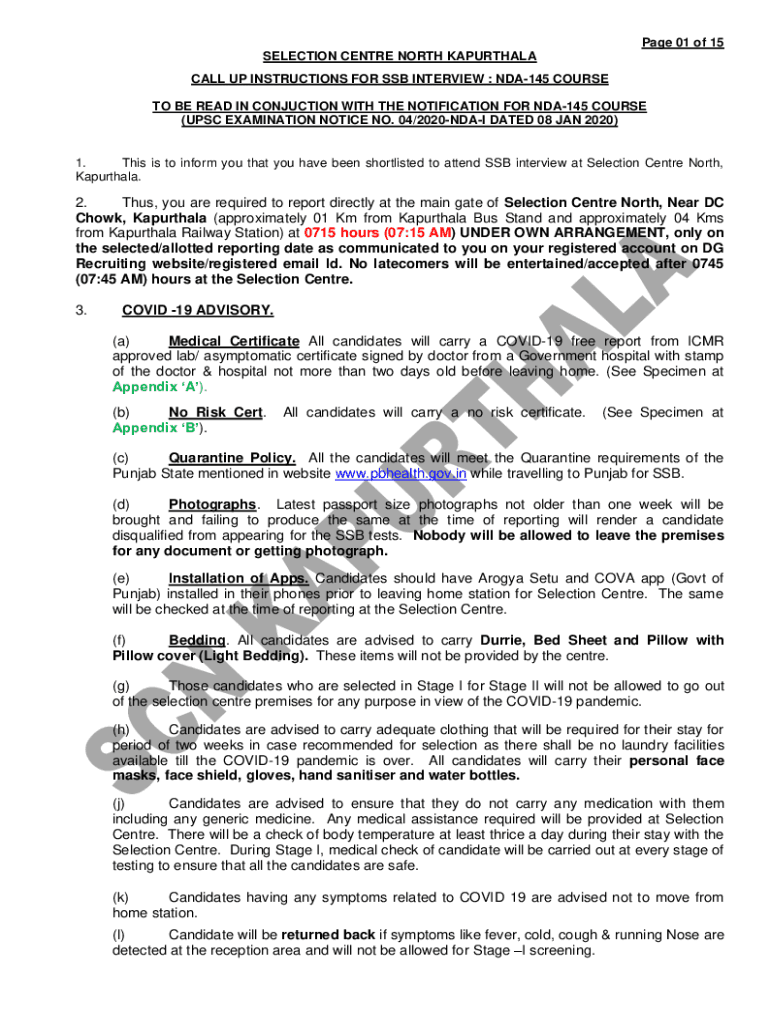 Page 01 of 15 SELECTION Center NORTH KAPURTHALA CALL UP INSTRUCTIONS FOR SSB INTERVIEW : NDA145 COURSE TO BE READ IN CONJUNCTION WITH THE NOTIFICATION FOR NDA145 COURSE (UPSC EXAMINATION NOTICE NO.