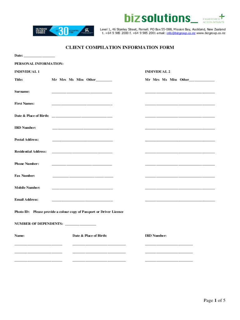 Level 1, 46 Stanley Street, Parnell. PO Box 55088, Mission Bay, Auckland, New Zealand t. +64 9 985 2000 f. +64 9 985 2001 email: info@bizgroup.co.nz www.bizgroup.co.nzCLIENT COMPILATION INFORMATION