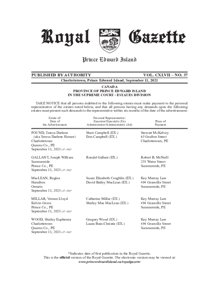 Prince Edward Island PUBLISHED BY AUTHORITY. CLVII NO. 37Charlottetown, Prince Edward Island, September 11, 2021, CANADA PROVINCE OF PRINCE EDWARD ISLAND IN THE SUPREME COURT ESTATES DIVISION TAKE