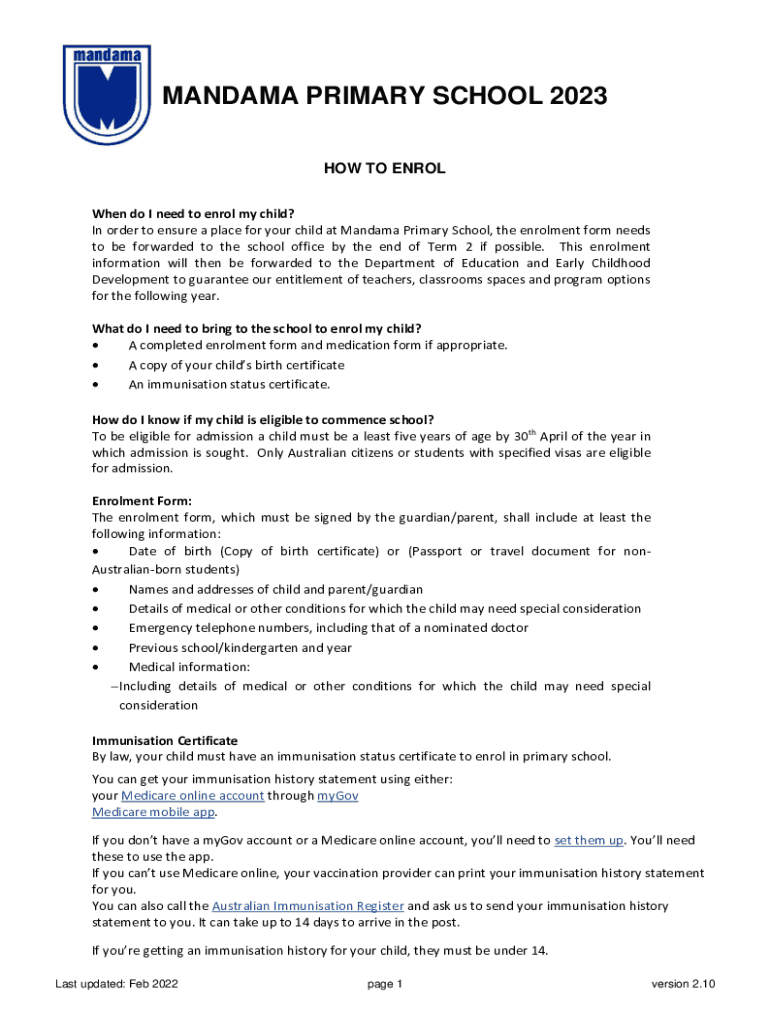 MANDALA PRIMARY SCHOOL 2023 HOW TO ENROL When do I need to enrol my child? In order to ensure a place for your child at Mandala Primary School, the enrollment form needs to be forwarded to the school