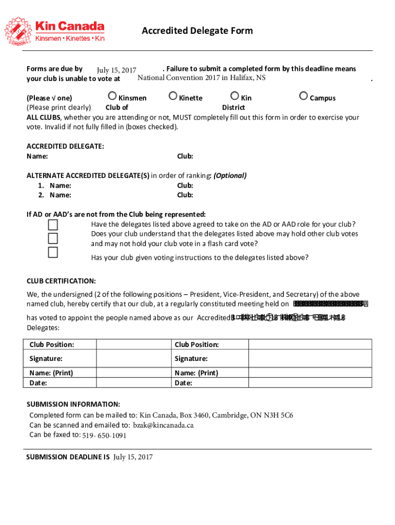 Accredited Delegate Form Forms are due by. Failure to submit a completed form by this deadline means July 15, 2017, National Convention 2017 in Halifax, NS your club is unable to vote at (Please one)