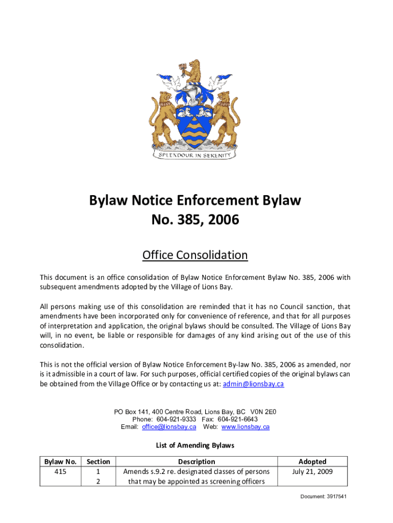 Bylaw Notice Enforcement Bylaw No. 385, 2006 Office Consolidation This document is an office consolidation of Bylaw Notice Enforcement Bylaw No. 385, 2006 with subsequent amendments adopted by the