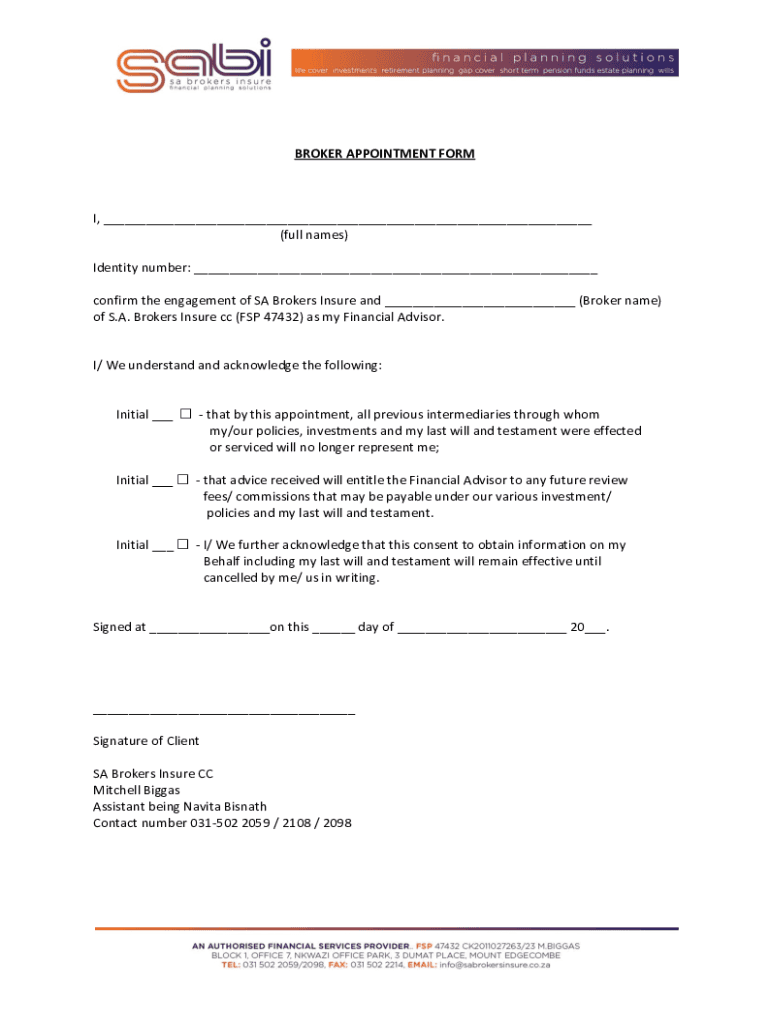 BROKER APPOINTMENT FORM, ___ (full names) Identity number: ___ confirm the engagement of SA Brokers Insure and ___ (Broker name) of S.A. Brokers Insure cc (FSP 47432) as my Financial Advisor. I/ We