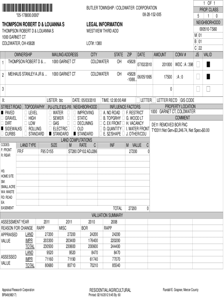 *051788000000* *05178800.0000×BUTLER TOWNSHIP / GOLDWATER CORPORATION 0828152005THOMPSON ROBERT D & JOANNA LEGAL INFORMATIONTHOMPSON ROBERT D & JOANNA S 1000 GARNET CT GOLDWATER, OH 45828WESTVIEW
