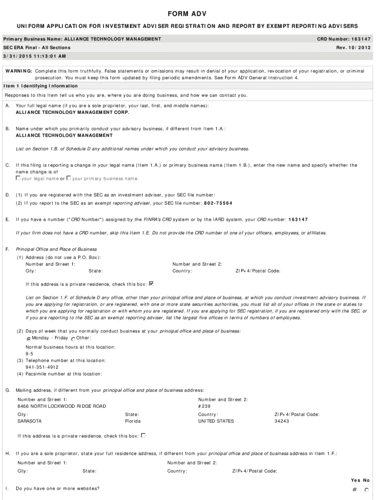 FORM ADV UNIFORM APPLICATION FOR INVESTMENT ADVISER REGISTRATION AND REPORT BY EXEMPT REPORTING ADVISERS Primary Business Name: ALLIANCE TECHNOLOGY MANAGEMENT CRD Number: 163147SEC ERA Final All Sections