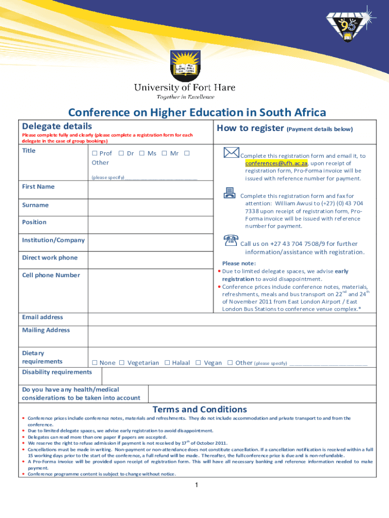 Get the free Registration Form - Conference onHigher Education in South Afri