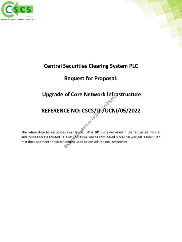 Central Securities Clearing System PLC Requests for Proposal: Upgrade of Core Network Infrastructure REFERENCE NO: CSS/IT /CNI/05/2022The return date for responses against this RFP is 30th June delivered