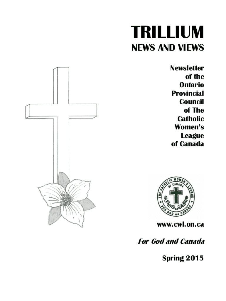 TRILLIUM NEWS AND VIEWS Newsletter of the Ontario Provincial Council of The Catholic Women's League of Canada.CWL.on.for God and Canada Spring 2015Table of ContentsEditors Notes: Ontario Provincial