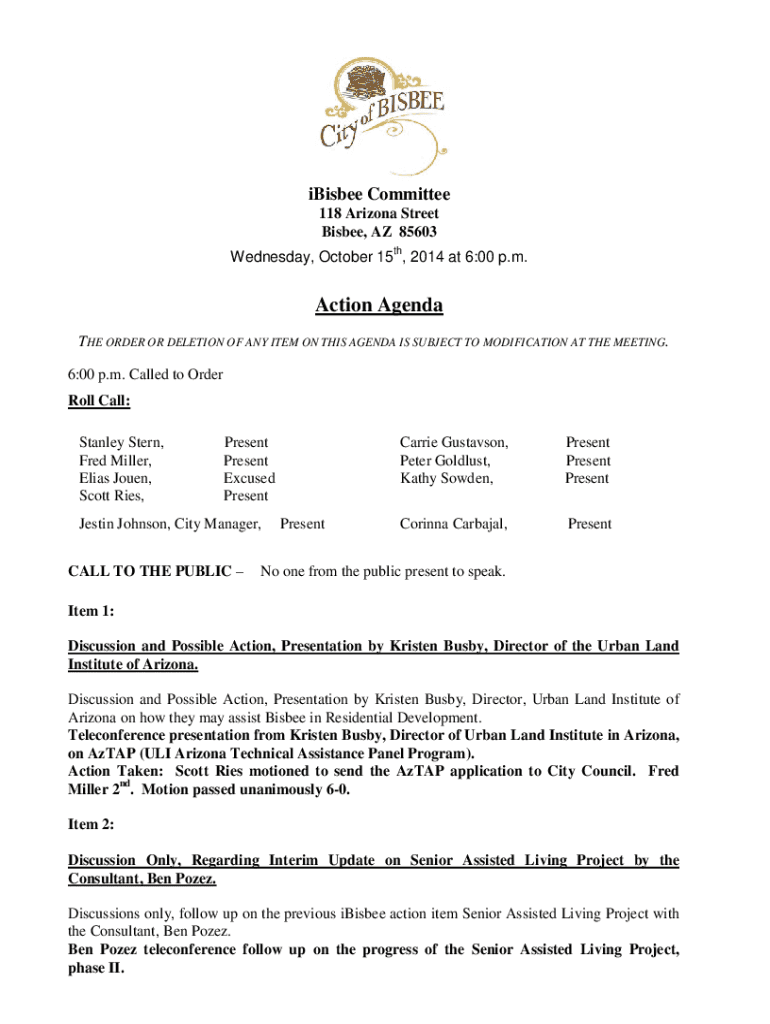 IBis bee Committee 118 Arizona Street Bisbee, AZ 85603 Wednesday, October 15th, 2014 at 6:00 p.m. Action Agenda THE ORDER OR DELETION OF ANY ITEM ON THIS AGENDA IS SUBJECT TO MODIFICATION AT THE MEETING.