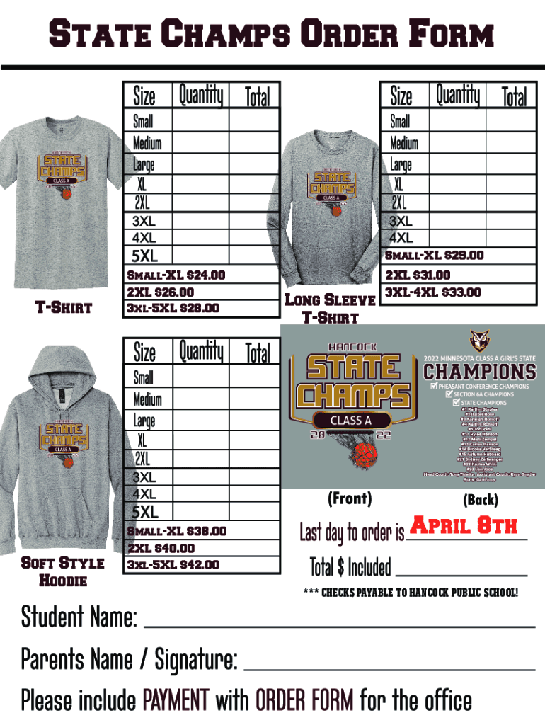 State Champs Order Form5XLSmallXL $29.00 2XL $31.00SmallXL $24.00TShirt2XL $26.00 3xl5XL $28.005XL Small XL $38.00Soft Style Hoodie Long Sleeve TShirt3XL4XL $33.00April 8th2XL $40.00 3xl5XL $42.00