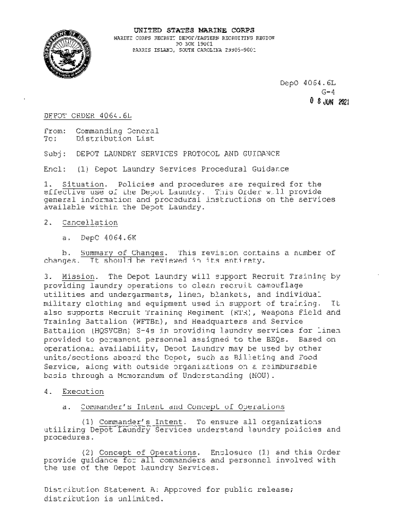 UNITED STATES MARINE CORPS RECRUIT DEPOT/EASTERN RECRUITING REGION 90 BOX 19001 PARIS ISLAND, SOUTH CAROLINA 299059001DepO 4064.6L G408 JUN 202i DEPOT ORDER 4064.6L From: To:Commanding General Distribution