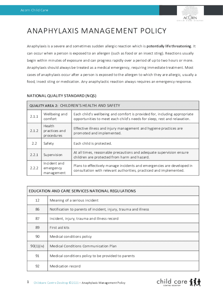 Get the free 1 Title: Anaphylaxis Policy for Child Day Programs Date
