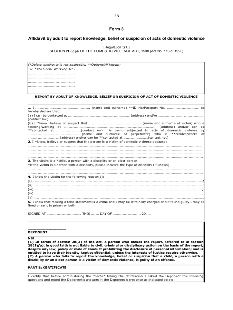 28 Form 3 Affidavit by adult to report knowledge, belief or suspicion of acts of domestic violence [Regulation 5(1)] SECTION 2B(2)(a) OF THE DOMESTIC VIOLENCE ACT, 1998 (Act No. 116 of 1998)(*Delete