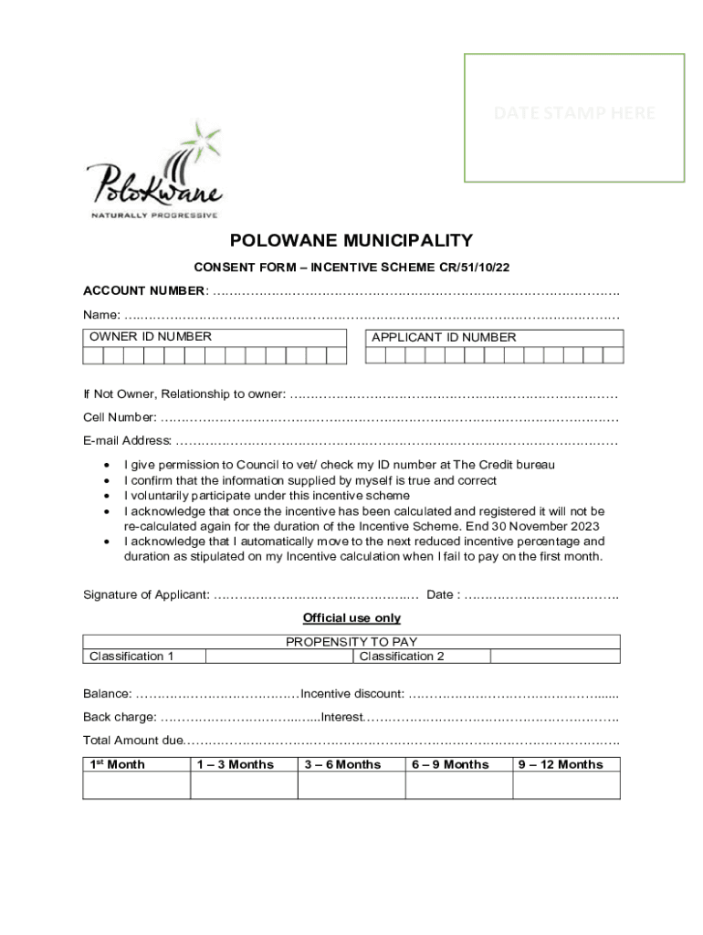 DATE STAMP HEREPOLOWANE MUNICIPALITY CONSENT FORM INCENTIVE SCHEME CR/51/10/22 ACCOUNT NUMBER:. Name:. OWNER ID NUMBERAPPLICANT ID Number Not Owner, Relationship to owner: Cell Number: