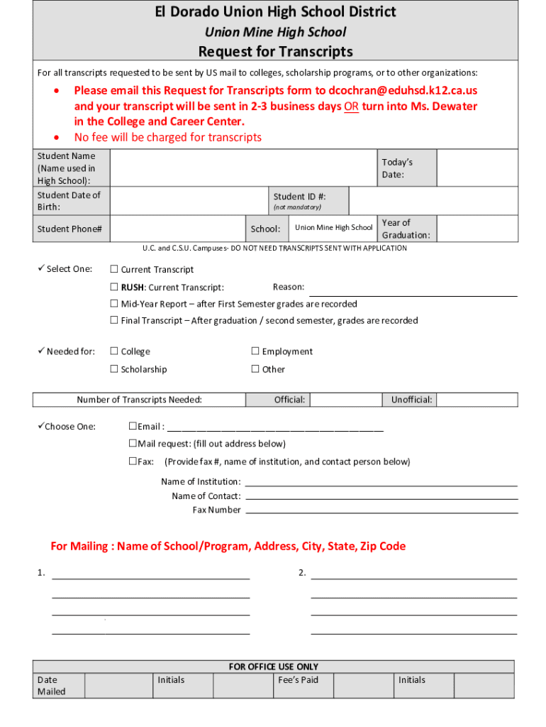 El Dorado Union High School District Union Mine High SchoolRequest for Transcripts For all transcripts requested to be sent by US mail to colleges, scholarship programs, or to other organizations: