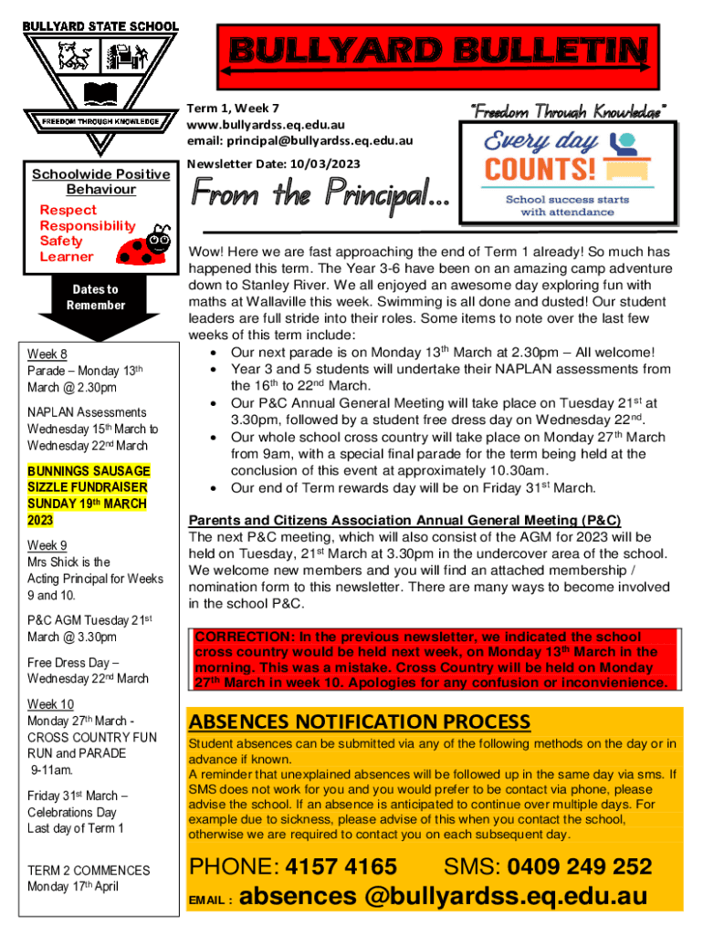 BULLY ARD BULLETIN Freedom Through KnowledgeTerm 1, Week 7 www.bullyardss.eq.edu.au email: principal@bullyardss.eq.edu.au School wide Positive Behavior Respect Responsibility Safety Learner Dates